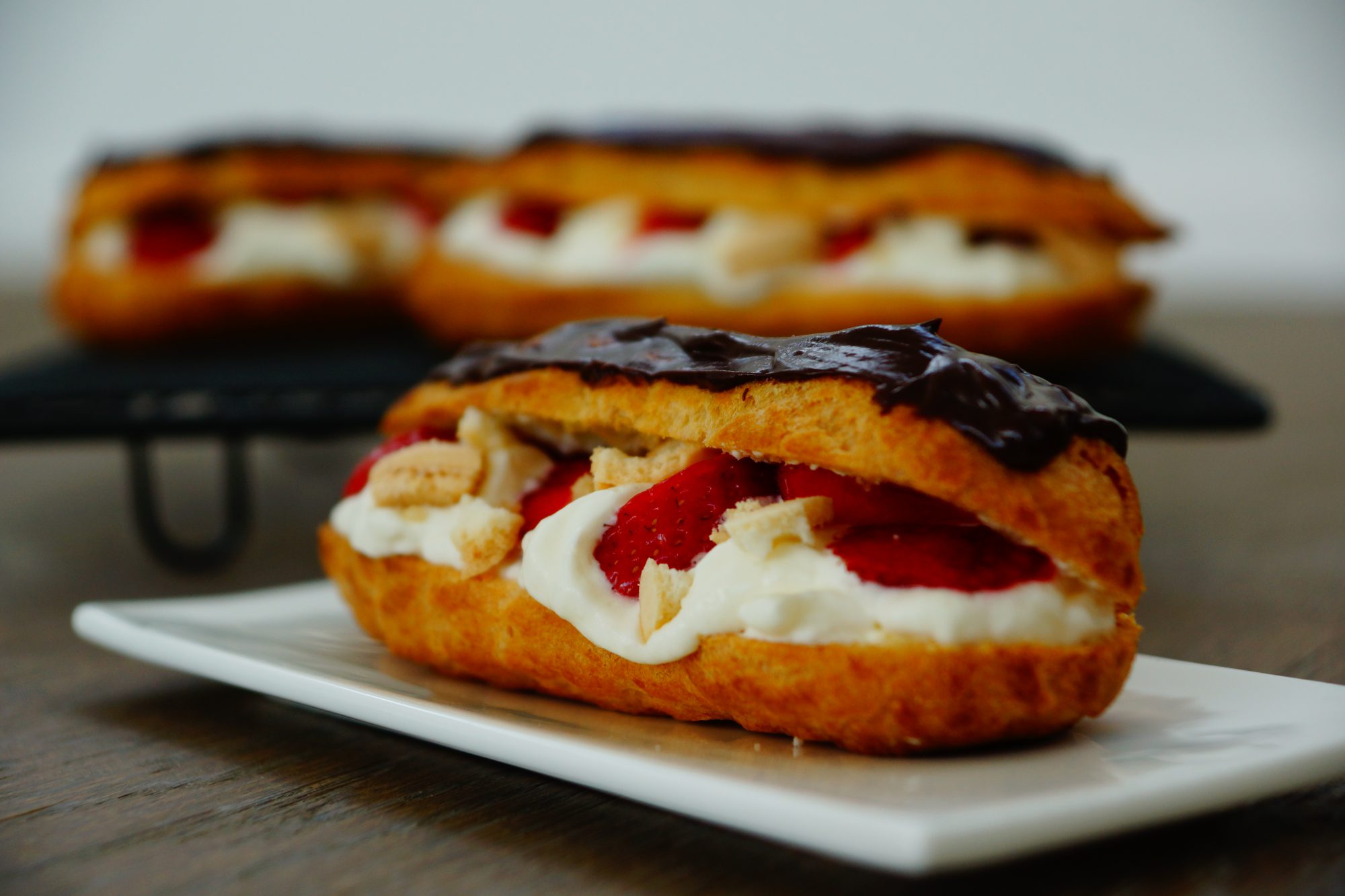 Push the Eclair open, fill with cream and strawberries, sprinkle with crushed meringues and enjoy!